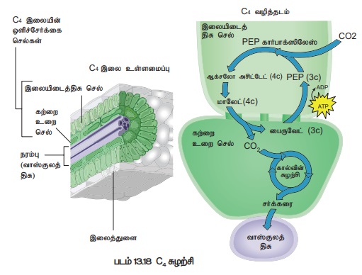 3. PEP கார்பாக்ஸிலேஸ் ஆக்ஸிஜனுடன் செயலற்ற தன்மை உடையது. எனவே C4 சுழற்சியில் ஆக்ஸிஜனால் எந்தத் தடை விளைவும் ஏற்படுத்துவதில்லை.
