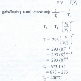 9. பெட்ரோல் இயந்திரமொன்றில் (உள் எரி இயந்திரம்) வளிமண்டல அழுத்தத்தில் 20°C வெப்பநிலையிலுள்ள - காற்று பிஸ்டன் ஒன்றின் மூலம் இறுதி பருமன் அதன் தொடக்க பருமனில் 1/8 பங்கு உள்ளவாறு அமுக்கப்படுகிறது. அமுக்கப்பட்ட காற்றின் வெப்பநிலையைக் கணக்கிடுக. (காற்றுக்கு γ =1.4).