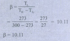 15. இலட்சிய குளிர்பதனப்பெட்டி ஒன்று அதில் வைக்கப்பட்டுள்ள பொருள்களின் வெப்பநிலையை 0°C ல் வைத்திருக்கின்றது. குளிர்பதனப்பெட்டி வைக்கப்பட்டுள்ள அறையின் வெப்பநிலை 27°C எனில் அக்குளிர்பதனப்பெட்டியின் செயல்திறன் குணகத்தைக் (COP) காண்க.
