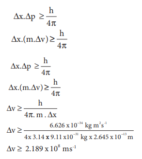 Δv ≥ (6.626 × 10-34 kg m2s-1) / (4 × 3.14 × 9.11 × 10-31 kg × 2.645 × 10-13 m)
