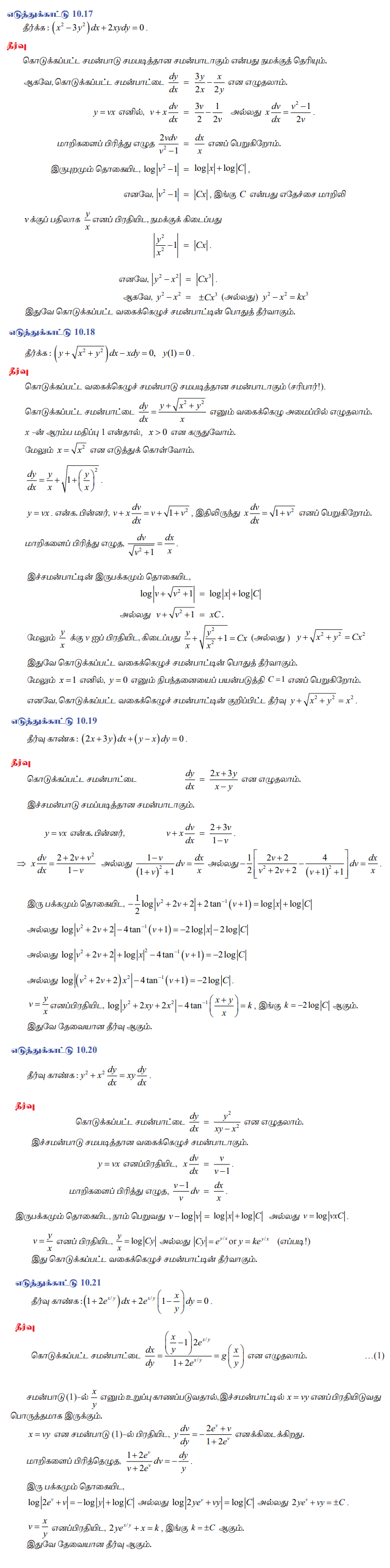 முதல் வரிசை, முதற்படி வகைக்கெழுச் சமன்பாடுகளின் தீர்வு (Solution of First Order and First Degree Differential Equations) | கணிதவியல் - சமபடித்தான அமைப்பு அல்லது சமபடித்தான வகைக்கெழுச் சமன்பாடுகள் (Homogeneous Form or Homogeneous Differential Equation) | 12th Maths : UNIT 10 : Ordinary Differential Equations