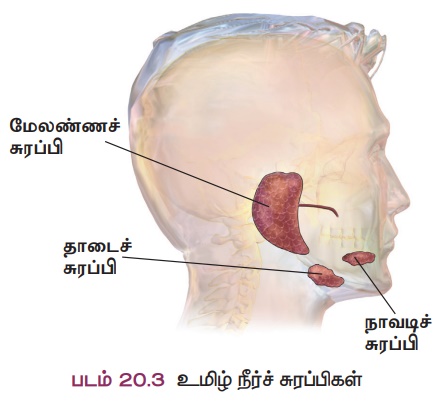 iii. கீழ் மற்றும் மேல் தாடைச் சுரப்பிகள்: இவை கீழ் தாடையின் கோணங்களில் காணப் படுகின்றன.