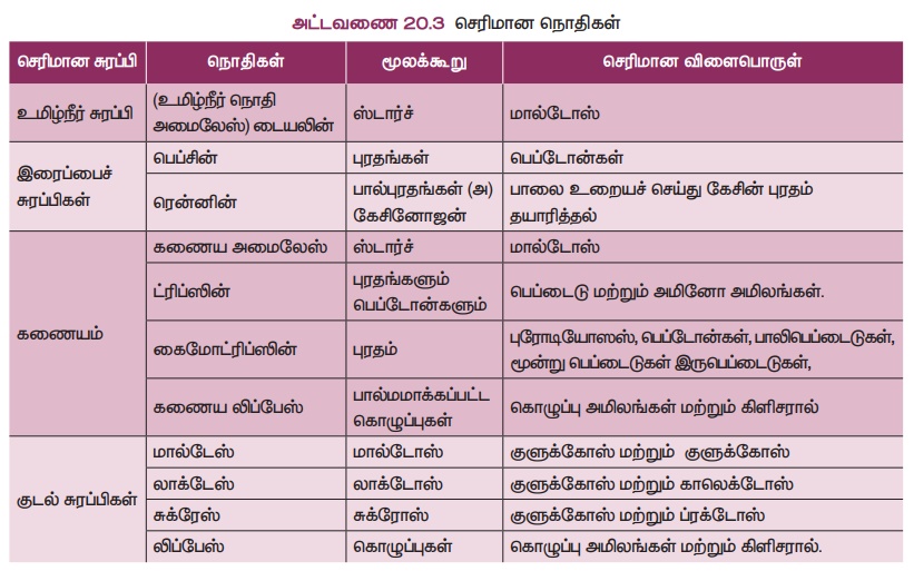 மால்டேஸ், லாக்டேஸ் மற்றும் லிப்பேஸ் போன்ற நொதிகள் காணப்படுகின்றன.