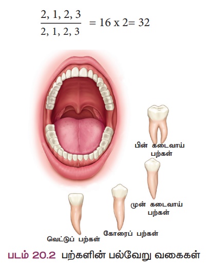 அட்டவணை 20.2 பற்களின் வகைகளும் அவற்றின் பணிகளும்