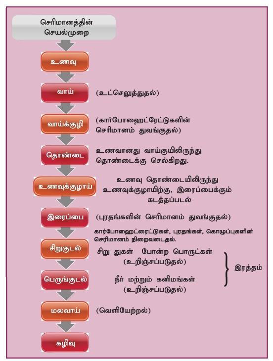 கடினமான, கரையாத் தன்மையுடைய உணவு மூலக்கூறுகளானவை செரிமான நொதிகளின் செயலால் சிறிய,