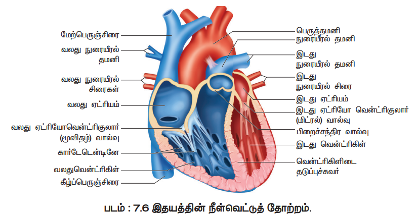 மேற்புற இரு ஆரிக்கிள்களும் ஆரிக்குலார் இடைச்சுவரினாலும் வென்ட்ரிக்கிள்கள் வென்ட்ரிக்குலார் இடைச்சுவரினாலும் பிரிக்கப்பட்டுள்ளன. இத்தடுப்புச்சுவர்களின் மூலம் ஆக்ஸிஜனுள்ள மற்றும் ஆக்ஸிஜனற்ற இரத்தம் ஒன்றாகக் கலந்து விடாமல் தடுக்கப்படுகிறது. ஆரிக்கிள்கள், வென்ட்ரிக்கிள்களுடன் ஆரிக்குலோ வென்ட்ரிக்குலார்துளை (Auriculo ventricular aperture) வழியே தொடர்பு கொள்கிறது. ஆரிக்குலோ வென்ட்ரிக்குலார் துளை ஆரிக்குலோ வென்ட்ரிக்குலார் வால்வுகளால் பாதுகாக்கப்படுகிறது. வலப்புற ஆரிக்குலோ வென்ட்ரிக்குலார் துளை மூவிதழ் வால்வினால் (Tricuspid valve) பாதுகாக்கப்படுகிறது. இடது ஆரிக்குலோ வென்ட்ரிக்குலார் துளை, ஈரிதழ் வால்வு (Bicuspid valve) அல்லது மிட்ரல் வால்வினால் (Mitral valve) பாதுகாக்கப்படுகிறது (படம் 7.6). இரத்தத்தை ஒரே திசையில் ஆரிக்கிள்களிலிருந்து வென்ட்ரிக்கிள்களுக்கும் வென்ட்ரிக்கிள்களிலிருந்து நுரையிரல் தமனி அல்லது அயோர்டாவிற்கு மட்டுமே செல்ல இந்த வால்வுகள் அனுமதிக்கின்றன. இந்த வால்வுகள் இரத்தம் பின்னோக்கிச் செல்வதைத் தடுக்கின்றன.