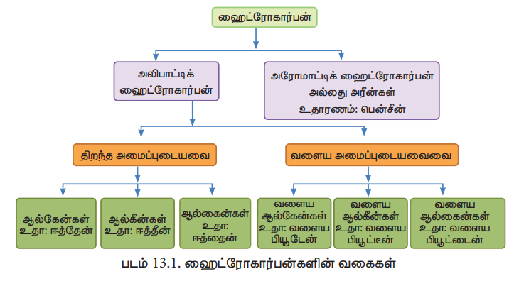 ● கார்பன் அணுக்களுக்கிடையே உள்ள பிணைப்பின் தன்மையைக் கொண்டு ஹைட்ரோ கார்பன்களை வகைப்படுத்துதல்