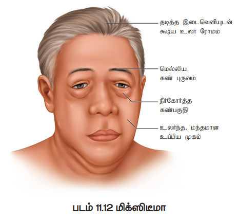 பெரியவர்களுக்கு தைராய்டு சுரப்பு குறைவதனால் மிக்ஸிடீமா ஏற்படுகின்றது. இது கல்லின் நோய் (Gull's disease) என்றும் அழைக்கப்படுகின்றது. குன்றிய மூளைச் செயல்பாடு, நினைவாற்றல் இழப்பு, நிதானமான உடலியக்கம், நிதானமான பேச்சு மற்றும் பொதுவான உடல் பலவீனம், உலர்ந்த, சொரசொரப்பான தோல், தோலில் ஆங்காங்கே மட்டும் உரோமங்கள், உப்பிய முகம், பிறழ்ந்த இனஉறுப்புச் செயல்பாடுகள், குறைந்த அடிப்படை வளர்சிதை மாற்ற வீதம் (BMR), பசியின்மை, குறைந்த உடல் வெப்ப நிலை போன்றவை மிக்ஸடீமா நோயின் அறிகுறிகள் ஆகும் (படம் 11.12).
