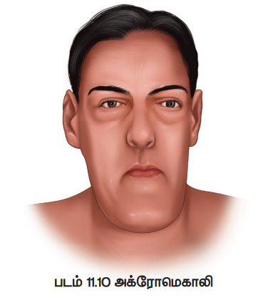 பெரியவர்களுக்கு வளர்ச்சி ஹார்மோன் அதிகரிப்பதால் இந்நிலை தோன்றுகின்றது. அக்ரோமெகாலியின் சில அறிகுறிகளாவன, கை எலும்புகள், கால் பாத எலும்புகள் மற்றும் தாடை எலும்புகள் மிகை வளர்ச்சி பெறுகின்றன. மேலும், இன உறுப்புகளின் ஒழுங்கற்ற செயல்பாடுகள், வயிற்றுறுப்புகள்,நாக்கு, நுரையீரல், இதயம், கல்லீரல், மண்ணீரல், மற்றும் நாளமில்லாச்சுரப்பிகளான தைராய்டு, அட்ரினல் போன்றவைபெரிதாதல் ஆகியவையும்இந்நோயின்அறிகுறிகளாகும் (படம் 11.10).