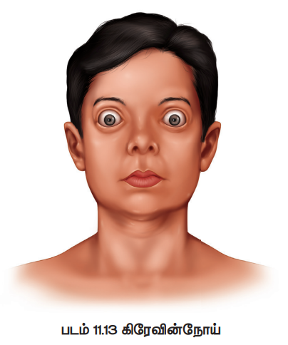 தைரோடாக்ஸிகோசிஸ் அல்லது எக்ஸாப்தால்மிக் காய்ட்டர் (Exopthalmic goitre) எனவும் இந்நோய் அழைக்கப்படுகிறது. தைராக்ஸின் மிகை சுரப்பால் இந்நோய் ஏற்படுகின்றது. தைராய்டு சுரப்பியில் வீக்கம், அடிப்படை வளர்சிதை மாற்ற வீதம் உயர்வு (BMR 50 – 100%), உயர்சுவாச வீதம், உயர் கழிவு நீக்க வீதம், மிகை இதயத்துடிப்பு, மிகை இரத்த அழுத்தம், மிகை உடல் வெப்பநிலை, துருத்தியகண்கள், கண்தசைகளின் செயல்குறைபாடு மற்றும் உடல் எடைகுறைவு போன்றவை இந்நோயின் அறிகுறிகள் ஆகும் (படம் 11.13).