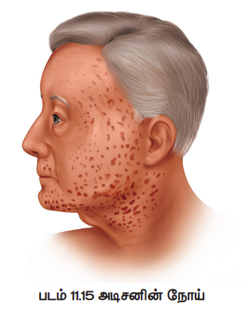 இந்நிலை அட்ரினல் கார்டெக்ஸில் இருந்து குளுக்கோ கார்டிகாய்டுகள் மற்றும் தாதுகலந்த கார்டிகாய்டுகள் குறைவாகச் சுரப்பதால் ஏற்படுகின்றது. தசைப்பலமின்மை, குறை இரத்த அழுத்தம், பசியின்மை, வாந்தி, தோலில் நிறமிகள் அதிகரிப்பு, குறைந்த வளர்சிதை மாற்றம், குறை உடல் வெப்பநிலை, இரத்த அளவு குறைதல், உடல் எடை இழப்பு போன்றன இந்நோயின் அறிகுறிகளாகும் (படம் 11.15). குறைவான ஆல்டோஸ்டீரோன் உற்பத்தியினால், நீர், சோடியம், குளோரைடு ஆகியவை அதிக அளவில் சிறுநீரோடு வெளியேறுகின்றன. பொட்டாசியத்தின் அளவும் குறைவதால் நீரிழப்பு ஏற்படுகிறது.