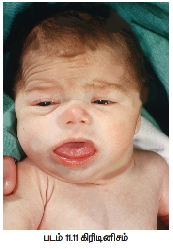 குழந்தைகளில் குறைதைராய்டு சுரப்பு காரணமாக இந்நிலை உண்டாகின்றது. இதனால், குறைவான எலும்புவளர்ச்சி, பால் பண்பில் முதிர்ச்சியின்மை, மனவளர்ச்சி குறைதல், தடித்த சுருங்கிய தோல், தடித்த துருத்திய நாக்கு, உப்பிய முகம், குட்டையான தடித்த கை மற்றும் கால்கள் ஆகியவை தோன்றுகின்றன. இதன் பிற அறிகுறிகள், குறைந்த அடிப்படை வளர்சிதை மாற்றவீதம், குறைந்த நாடித்துடிப்பு, குறைந்த உடல் வெப்பநிலை, மற்றும்இரத்தக் கொலஸ்டிரால் அளவு அதிகரிப்பு போன்றனவாகும் (படம் 11.11).