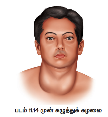 இது மண்டலக்கழலை (Endemic goitre) என்றும் அழைக்கப்படும். இது தைராக்ஸின் சுரப்பு குறைவதால் ஏற்படுகின்றது. தைராய்டு சுரப்பி வீங்குதல், சீரத்தில் தைராக்ஸின் அளவு குறைதல், TSH சுரத்தல் அதிகரிப்பு ஆகியன முன் கழுத்துக் கழலையின் சில அறிகுறிகளாகும் (படம் 11.14).