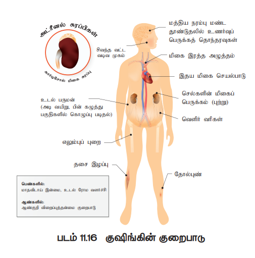 இந்நிலை பிட்யூட்டரியின் ACTH மிகைசுரப்பு மற்றும் குளுக்கோகார்டிகாய்டு (கார்டிசோல்) மிகை சுரப்பு ஆகியவற்றால் ஏற்படுகின்றது. முகம், நடுவுடல் மற்றும் பிட்டப்பகுதிகளில் பருத்த நிலை, முகம், கை, கால்களில் சிவந்த நிலை, கன்றிய மெல்லிய தோல், மிகை ரோம வளர்ச்சி, எலும்புகளில் தாதுக்கள் குறைதல் (Osteoporosis), சிஸ்டோலிக் மிகை இரத்த அழுத்தம் போன்றன இதன் பண்புகள் ஆகும். இனப்பெருக்க உறுப்புகளின் செயலிழப்பும் இதன் அறிகுறியாகும் (படம் 11.16).