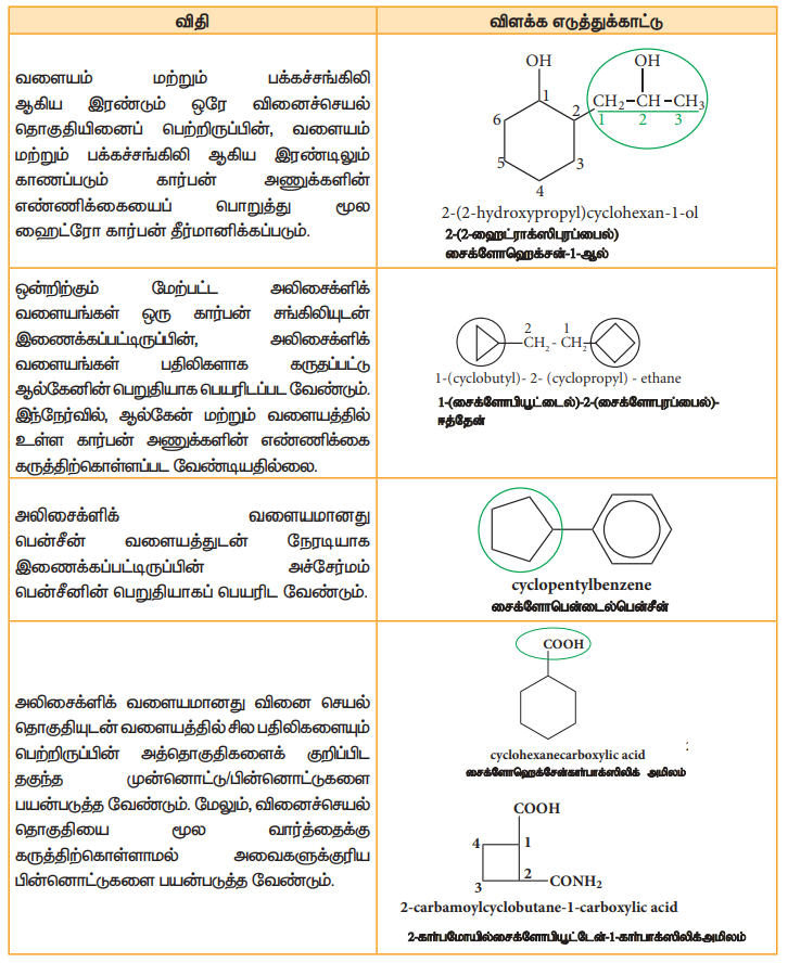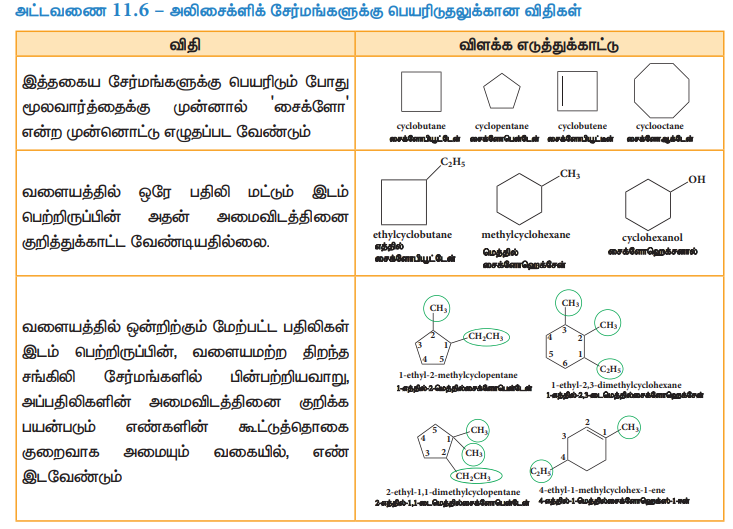 அட்டவணை 11.6 – அலிசைக்ளிக் சேர்மங்களுக்கு பெயரிடுதலுக்கான விதிகள்