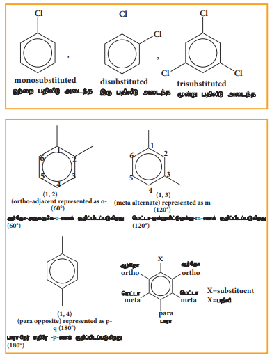 பென்சீன் வளையத்திலுள்ள ஒன்று, இரண்டு அல்லது மூன்று ஹைட்ரஜன் அணுக்கள் முறையே பிற தொகுதிகளால் பதிலீடு செய்யப்பட்டிருப்பின் அவைகள் முறையே மோனோ, டை மற்றும் ட்ரை பதிலீடு செய்யப்பட்ட பெறுதிகள் என அழைக்கப்படுகின்றன.