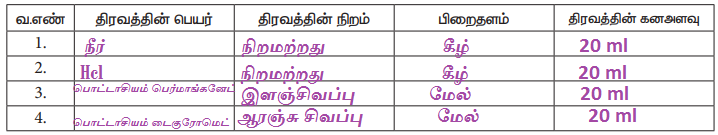 கொடுக்கப்பட்டுள்ள நிறமற்ற மற்றும் நிறமுள்ள திரவங்களின் கனஅளவை அளவிடல்