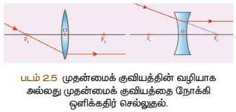 மீது விழும் ஒளிக்கதிர்களும் விலகலடைந்த பிறகு முதன்மை அச்சுக்கு இணையாகச்