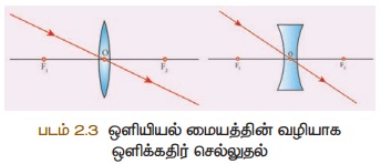 அல்லது குழிலென்சின் ஒளியியல் மையத்தின் வழியாகச் செல்லும் போது விலகலடையாமல் அதே