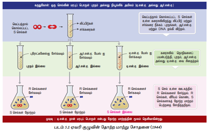 பின்னர் 1944ல், ஆஸ்வால்டு ஏவரி (Oswald T.Avery) காலின் மேக்லியாட் (Colin M.Macleod) மற்றும் மேக்லின் மெக்கார்டி (Maclyn J.Mc Carty) ஆகியோர், 'உடல்வெளி (invitro) முறை மூலம் கிரிஃபித்தின் சோதனைகளை மீள மேற்கொண்டனர். இதன் மூலம், வீரியமற்ற பாக்டீரியாவை வீரியம் கொண்டதாக மாற்றுகிற தோற்றமாற்ற நிகழ்வுக்குக் காரணமான பொருட்களை அடையாளம் காண முயன்றனர். இவ்வாய்வின் போது, வெப்பத்தினால் கொல்லப்பட்ட S-வகை பாக்டீரியாவிலிருந்து டி.என்.ஏ, ஆர்.என்.ஏ மற்றும் புரதங்கள் பிரித்தெடுக்கப்பட்டு அவை R-வகை பாக்டீரியாவினுள் சேர்க்கப்பட்டன. இதன் விளைவாக R-வகையின் சொரசொரப்பான புறப்பரப்பு மென்மையாக மாறியது மட்டுமல்லாமல், அவை, நோயூக்கியாகவும் மாறின (படம் 5.1). ஆனால், டி.என்.ஏ. யேஸ் (டி.என்.ஏ சிதைவு நொதி) நொதியுடன் பிரித்தெடுக்கப்பட்ட பகுதியை வினைபுரிய செய்த பின், செலுத்தப்பட்ட போது, தோற்றமாற்றம் செய்யும் பண்பை அது இழந்திருந்தது. ஆனால், ஆர்.என்.ஏ. யேஸ் (ஆர்.என்.ஏ சிதைவு நொதி) அல்லது புரோட்டினேஸ் (புரத சிதைப்பு நொதி) ஆகியவை எதுவும் தோற்றமாற்ற நிகழ்வை பாதிக்கவில்லை. எனவே, தோற்றமாற்ற நிகழ்விற்கு டி.என்.ஏ. வே காரணம் என்பது, டி.என்.ஏ.யேஸால் செரிக்கப்பட்டதால் ஏற்பட்ட தோற்றமாற்ற பண்பு இழப்பிலிருந்து, தெரிய வருகிறது. இச்சோதனைகள், டி.என்.ஏ. வே மரபணுப் பொருளாகவும் புரதம் அல்ல என்பதையும் காட்டுகின்றன. ஒரு வகை செல்லிலிருந்து (S-வகை) எடுக்கப்பட்ட டி.என்.ஏவை இன்னொரு வகை செல்லிற்குள் (R-வகை) செலுத்தும்போது, முதல் வகை (S-வகை)யின் சில பண்புகள் மீளக்கிடைக்கின்றன. இம்மொத்த நிகழ்வே தோற்றமாற்றம் (Transformation) எனப்படும்.
