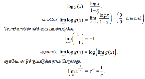 x → 1 எனில் 1∞ எனும் தேரப்பெறாத வடிவில் உள்ளது. g(x) = x1/1-x என்க. மடக்கை எடுக்க