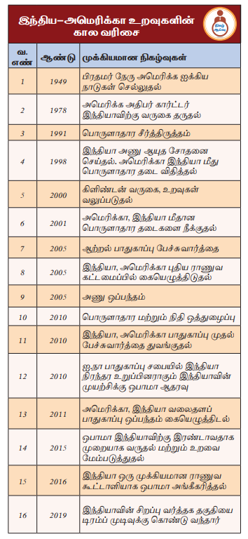 பாகிஸ்தான் எல்லைக் கட்டுப்பாட்டு கோட்டை மீறி கார்கில் போரில் ஈடுபட்டபோது அமெரிக்கா அதை கண்டித்து இந்தியாவின் நிலைக்கு ஆதரவளித்தது. அதை இந்தியாவும் வரவேற்றது. இந்தியாவிற்கு 2000ஆம் ஆண்டில் அமெரிக்க அதிபர் கிளிண்டனின் வருகை இந்திய-அமெரிக்க உறவில் ஒரு புதிய அத்தியாயத்தை மலரச் செய்தது. வாஜ்பாய் இந்திய-அமெரிக்க உறவைப் பற்றி குறிப்பிடும்போது டிஜிட்டல் உலகில் இந்தியாவும் அமெரிக்காவும் பக்கத்து நாடுகள் மற்றும் பங்காளிகள் என்றார். அதன் பின்பு, அறிவியல் தொழில்நுட்பம், சூழலியல் பாதுகாப்பு, பருவநிலை மாற்றம், கல்வி, எச்.ஐ.வி, சுனாமி மீட்பு போன்றவற்றில் இரு நாடுகளும் ஒத்துழைப்புடன் செயல்பட முடிவெடுத்தன. அதன் தொடர்ச்சியாக புஷ் நிர்வாகத்தின் போதும், இதே இணக்கமான பாதையில் இரு நாட்டு உறவு பயணித்தது. இரு நாடுகளும் இயற்கையாகவே கூட்டாளிகள் என்றும் கூறப்பட்டன. இந்த உறவு, ஒபாமா அமெரிக்கா அதிபரான பிறகு நன்கு பக்குவமடைந்த ஒன்றாக மாறியது, பாதுகாப்பு, அணு ஆற்றல் போன்றவற்றில் புது ஒப்பந்தங்கள் போடப்பட்டன.