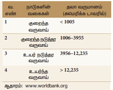 தலா வருமானம் உலக வங்கியின் அறிக்கையின்படி, நாடுகளின் வருமான அளவீடுகள் கீழ்க்கண்டவாறு புதியதாக வகைப்படுத்தப்பட்டுள்ளது