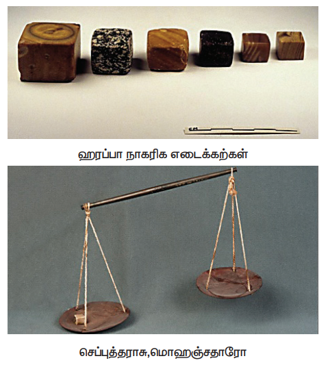 ஹரப்பா மக்கள் முறையான எடைகளையும் அளவுகளையும் பயன்படுத்தினார்கள். வணிகப் பரிமாற்றங்களில் ஈடுபட்ட காரணத்தால் அவர்களுக்கு முறைப்படுத்தப்பட்ட அளவுகள் தேவையாக இருந்தது. ஹரப்பாநாகரிகப்பகுதிகளில் கனசதுரமான செர்ட் எடைகள் கிடைத்துள்ளன. தராசுகளுக்கான செம்புத் தட்டுகள் கிடைத்துள்ளன. எடைகள் அவர்களுக்கு ஈரடிமான எண் முறை