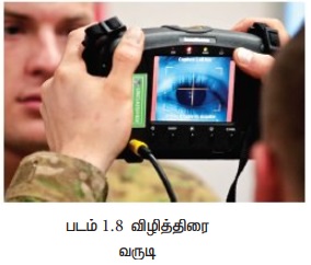 (6) விழித்திரை வருடி (Retinal Scanner): விழித்திரை வருடி என்பது ஒரு உயிரளவையியல் (biometric) நுட்பத்தில் செயல்படும் கருவி ஆகும். இது ஒரு நபரின் விழித்திரை இரத்த நாளங்களின் தனிப்பட்ட வடிவங்களைப் பயன்படுத்துகிறது.