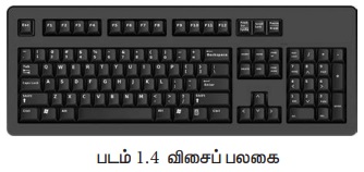 (1) விசைப்பலகை: விசைப்பலகை (கம்பி / கம்பியில்லா / மாய) கணிப்பொறிகளில் மிகவும் பொதுவாகப் பயன்படுத்தப்படும் உள்ளீட்டு சாதனம் ஆகும். எழுத்துகள், எண்கள் மற்றும் சிறப்பு குறியீடுகளுக்கான தனித்தனிப் பொத்தான்களை மொத்தமாக "எழுத்துரு பொத்தான்கள்" எனலாம். கணிப்பொறிகளில் பயன்படுத்தப்படும் விசைப்பலகை, தட்டச்சுப் பொறிகளில் (type writer) உள்ள விசைப் பொத்தான்களின் அடிப்படையில் தருவிக்கப்பட்டது. தரவுகளும், தகவல்களும் விசைப்பலகையின் மூலம் தட்டச்சு செய்து கணிப்பொறியில் உள்ளிடப்படுகின்றது. எழுத்து மற்றும் எண் வகை பொத்தான்களைத் தவிர வெவ்வேறு செயல்பாடுகளைச் செய்வதற்கான பிற செயல்பாட்டு பொத்தான்களும் (function keys) உள்ளன. விசைப்பலகையில் பல்வேறு வகை பொத்தான்களின் தொகுப்புகள் உள்ளன, அவை எழுத்துவகை, எண்வகை, செயல்பாட்டு வகை, நுழைவு மற்றும் பதிப்பாய்வு பொத்தான்கள் ஆகும்.