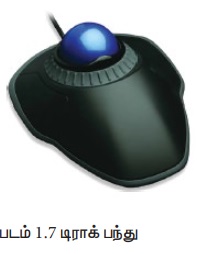 (5) டிராக் பந்து (Track Ball): டிராக் பந்து சுட்டியின் தலைகீழ் வடிவமைப்பைப் போன்றது, பயனர் பந்தை நகர்த்தும்போது, கருவி நகராமல் இருக்கும். திரையில் இயக்கங்களைச் செயல்படுத்துவதற்குப் பயனர் பல்வேறு திசைகளில் பந்தைச் சுழற்றுவார்.