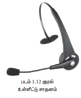 (10) குரல் உள்ளீட்டு சாதனம் (Voice Input Systems) : நுண்பேசி ஒரு குரல் உள்ளீடு சாதனமாகச் செயல்படுகிறது. இது குரல் தரவைப் பெற்று கணிப்பொறிக்கு அனுப்புகிறது. நுண் பேசியுடன், பேச்சினை உணர்ந்துகொள்ளும் மென்பொருளைப் பயன்படுத்திக் கணிப்பொறிக்கு உள்ளிடப்படும் தகவலுக்கான முற்றிலும் புதிய அணுகுமுறையை வழங்குகிறது.
