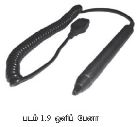 (7) ஒளிப் பேனா (Light Pen): ஒளிப் பேனா என்பது ஒரு பேனா போன்ற வடிவம் கொண்ட சுட்டிக்காட்டும் கருவி, அது திரையகத்துடன் இணைக்கப்படும். ஒளிப் பேனாவின் முனையில் ஒரு ஒளி உணர்திறன் (light - sensitive) கொண்ட பொருள் பொருத்தப்பட்டுள்ளது, அது திரையில் இருந்து வெளிச்சத்தைக் கண்டறிந்து பேனாவின் இடத்தை அடையாளம் காணக் கணிப்பொறிக்கு உதவுகிறது. ஒளிப் பேனாக்கள் திரையில் நேரடியாக வரையும் தன்மை கொண்டவை, ஆனால் இது பயன்படுத்தக் கடினமானது மேலும் துல்லியமாக வரைவதற்கு துணைபுரிவதில்லை.