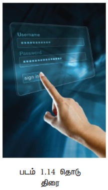(12) தொடு திரை (Touch Screen): தொடுதிரை என்பது ஒரு காட்சி சாதனம். இது பயனர் கணிப்பொறியுடன் ஊடாடுவதற்கு விரலைப் பயன்படுத்த அனுமதிக்கிறது. ஒரு வரைகலை பயனர் இடைமுகத்தில் (GUI) உலவுவதற்கு, சுட்டி அல்லது விசைப்பலகைக்கு மாற்றாகத் தொடு திரை பயன்படுகிறது. கணிப்பொறி மற்றும் மடிக்கணினி, திரையகம், ஸ்மார்ட் கைபேசிகள், டேப்லட்ஸ் (tablets), பணப்பதிவேடுகள் (cash registers) மற்றும் தகவல் கணிப்பொறியகம் (information kiosks) போன்ற பல்வேறு வகையான சாதனங்களில் தொடு திரை பயன்படுத்தப்படுகின்றன. சில தொடு திரைகள் தொடு உணர் திறனை உள்ளிடுவதற்குப் பதிலாக ஒரு விரலின் இருப்பை உணர, அகச்சிவப்பு பிம்பங்களின் ஒரு கட்டத்தைப் பயன்படுத்துகின்றன.