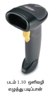 (9) பட்டைக் குறியீடு / கியூ. ஆர் பட்டை படிப்பான் (Bar Code / QR Code Reader) : பட்டைக் குறியீடு என்பது வெவ்வேறு தடிமன் வரிசையில் அச்சிடப்படும் ஒரு வடிவம் ஆகும். பட்டை குறியீட்டு படிப்பான், பட்டைக் குறியீட்டைப் படித்து அவற்றை மின் துடிப்புகளாக (electric pulses) மாற்றி கணிப்பொறி செயலகத்திற்கு அனுப்பும் ஒரு கருவியாகும். கணிப்பொறியில் தகவலை விரைவாகவும் பிழையின்றி பதிவு செய்யவும் இது பயன்படுகிறது.