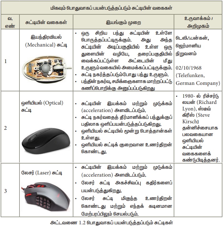 (2) சுட்டி : சுட்டி (கம்பி / கம்பியில்லா) என்பது திரையில் இடசுட்டின் (cursor) இயக்கத்தைக் கட்டுப்படுத்தும் ஒரு சுட்டுச் சாதனமாகும். கணிப்பொறியில் உள்ள பணிக் குறிகள் (icons), பட்டிகள் (menus), கட்டளை பொத்தான்கள் (command buttons) போன்றவற்றைத் தேர்ந்தெடுத்துச் செயல்படுத்துவதற்கு இது பயன்படுகிறது. கிளிக், இரட்டைக் கிளிக், வலது கிளிக், இழுத்து விடு போன்றவை, சுட்டியின் சில செயல்பாடுகள் ஆகும்.