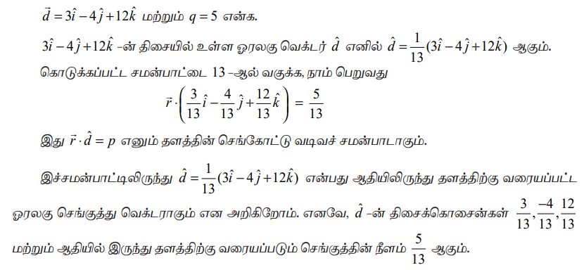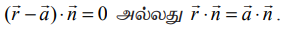 என்பது தளத்தில் உள்ள ஏதேனுமொரு புள்ளி (x,y,z) –ன் நிலைவெக்டர் எனில், தளத்தின் செங்கோட்டு வடிவ வெக்டர் சமன்பாடு