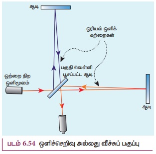 (i) ஒளிச்செறிவு அல்லது வீச்சுப் பிரிப்பு: பகுதி வெள்ளிபூசப்பட்ட கண்ணாடி (கற்றைப் பிரிப்பான்) வழியே ஒளியைச் செலுத்தும்போது, ஒரே நேரத்தில் ஒளி எதிரொளிப்பு மற்றும் ஒளிவிலகல் இரண்டும் ஏற்படும். ஒரே ஒளிமூலத்திலிருந்து இரண்டு ஒளிக்கற்றைகளைப் பெறுவதால், பிரிக்கப்பட்ட இவ்விரண்டு ஒளிக்கற்றைகளும் ஓரியல் ஒளிக்கற்றைகளாகச் செயல்படும். படம் 6.54 இல் காட்டியுள்ளவாறு இவ்விரண்டு ஓரியல் ஒளிக்கற்றைகளும் ஒரே கட்டத்தில் அல்லது மாறாத கட்ட வேறுபாட்டில் உள்ளன.