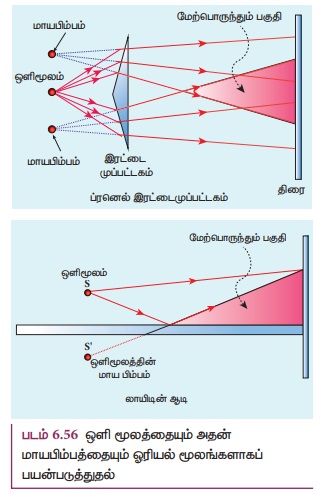 (iii) ஒளிமூலம் மற்றும் பிம்பங்கள்: இம்முறையில் ஒளிமூலமும் அதன் பிம்பமும் ஓரியல் ஒளிமூலத்தொகுப்பாகச் செயல்படுகின்றன. ஏனெனில், ஒளி மூலமும் அதன் பிம்பமும் ஒத்த கட்டத்தில் உள்ள அல்லது ஒரே கட்ட வேறுபாட்டையுடைய ஒளி அலைகளைக் தோற்றுவிக்கும். இது படம் 6.56 இல் காட்டப்பட்டுள்ளது . ப்ரனெல் (Fresnel's) இரட்டை முப்பட்டகத்தில்; இரண்டு மாய ஒளி மூலங்கள் ஓரியல்மூலங்களாகச் செயல்படுகின்றன. மேலும் லாயிட் (Lloyds) கண்ணாடியில் ஒரு ஒளி மூலமும் அதன் மாய பிம்பமும் இரண்டு ஓரியல் மூலங்களாகச் செயல்படுகின்றன.