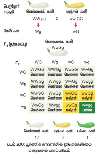 கலப்புறச் செய்யும்போது F2 இறுதியில் 12 வெள்ளை : 3 மஞ்சள் : 1 பச்சை என்ற