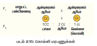 1:2:1 ஆக (முறையே 1 பச்சை (CC) : 2 ஆரியா (Cc) : 1 வெள்ளை (cc) ) உள்ளது. ஆனால் வெள்ளை