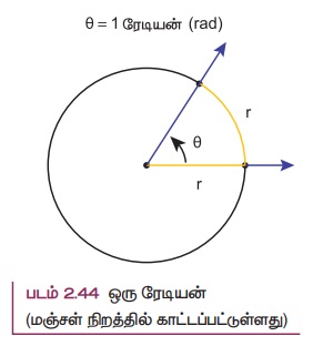 ரேடியன்: வட்டவில் வட்ட மையத்தில் ஒரு தளக் கோணத்தை உருவாக்குகிறது. வட்டவில்லின் நீளத்தை, வட்டத்தின் ஆரத்தால் வகுக்கக்கிடைக்கும் மதிப்பே ரேடியன் ஆகும். வட்டத்தின் ஆரத்திற்கு சமமான நீளமுள்ள வட்டவில், வட்டமையத்தில் ஏற்படுத்தும் கோணம் ஒரு ரேடியன் ஆகும். இது படம் 2.44 யில் காட்டப்படுள்ளது.