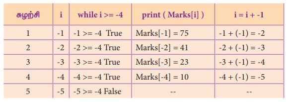 சுட்டெண் மதிப்பு இறுதியிலிருந்து பின் வரிசையில் (அதாவது பின்னோக்கு வரிசை) உறுப்புகளை