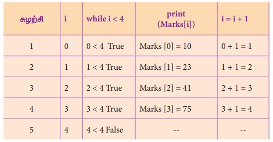 மேலே உள்ள எடுத்துக்காட்டில் marks என்ற List 10,23,41,75 என்றநான்கு