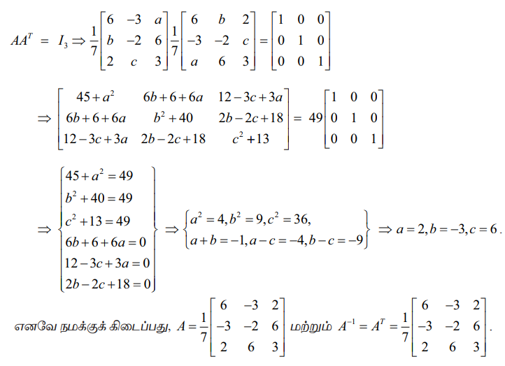 என்பது செங்குத்து அணி எனில் a, b மற்றும் c களின் மதிப்பைக் காண்க. இதிலிருந்து A−1 −ஐக் காண்க.