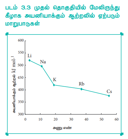 படம் 3.3 முதல் தொகுதியில் மேலிருந்து கீழாக அயனியாக்கும் ஆற்றலில் ஏற்படும் மாறுபாடுகள்