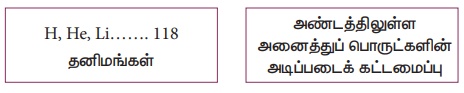 இதேபோல் பூமியில் உள்ள அனைத்துப் பொருட்களும் தனிமங்கள் எனப்படும் சில எளிமையான பொருட்களால் உருவாக்கப் படுகின்றன. செடிகள், பூனைகள், ஆப்பிள்கள், பாறைகள், கார்கள் மற்றும் நமது உடல் அனைத்திலும் தனிமங்கள் உள்ளன. எனவே அனைத்துப் பொருட்களுக்குமான கட்டமைப்பு தனிமங்களே ஆகும்.
