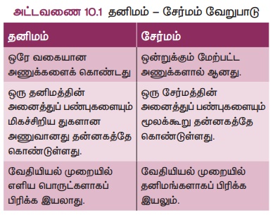 அட்டவணை 10.1 தனிமம் – சேர்மம் வேறுபாடு