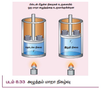 வாயுவை வெப்பப்படுத்தும்போது வாயு வெப்பமடைந்து பின்னர் அது பிஸ்டனைத் தள்ளுகிறது. எனவே வாயுவானது வளிமண்டல அழுத்தம் மற்றும் புவியீர்ப்பு விசை இவற்றின் கூடுதலுக்குச் சமமான ஓர் விசையை பிஸ்டனின் மீது செலுத்துகிறது எனில் இந்நிகழ்வு ஓர் அழுத்தம்மாறா நிகழ்வாகும். இது படம் 8.33 இல் காட்டப்பட்டுள்ளது.