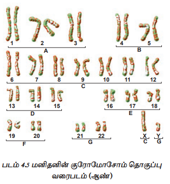 சென்ட்ரோமியரின் இடம் மற்றும் இரு கரங்களின் ஒப்பீட்டு நீளம் இவற்றின் அடிப்படையில் மனித குரோமோசோம்களை மூன்று வகையாக பிரிக்கலாம். அவையாவன: மெட்டா சென்ட்ரிக், துணைமெட்டாசென்ட்ரிக் மற்றும் அக்ரோசென்ட்ரிக் ஆகும். குரோமோசோம்களின் புகைப்படத்தை அவற்றின் நீளத்தை அடிப்படையாக கொண்டு இறங்குவரிசையில் A முதல் G வரை குழுக்களாக வகைப்படுத்தப்படுகின்றன (படம் 4.5).